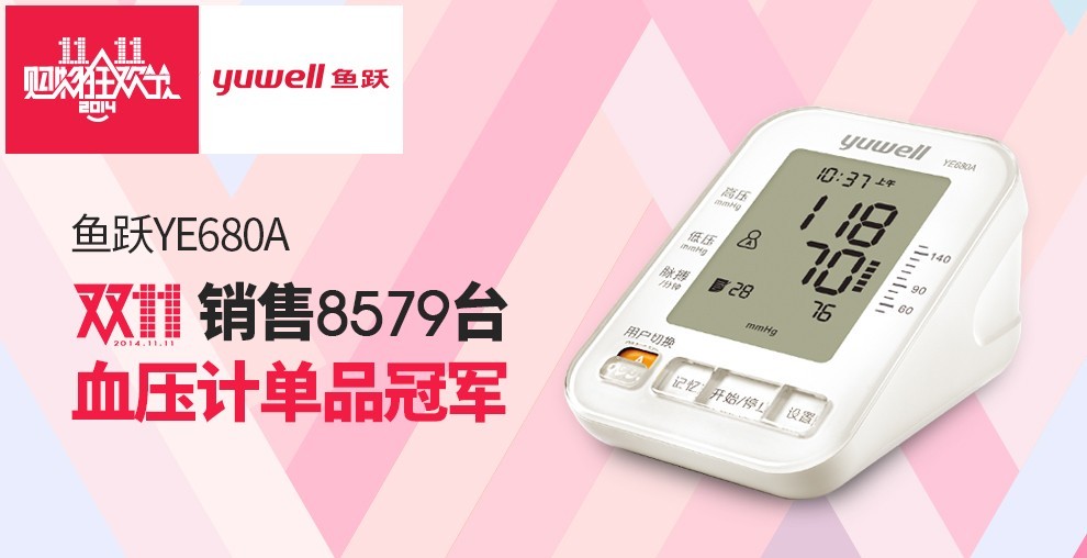 鱼跃血压计从水银到电子,20年品质精准不变,YE680A电子血压计基于10万例高血压人群测量数据参数及波形优化,独创DFFA算法,使其更加稳定、更加精准。凭借其前期积累的产品口碑与极高的性价比,当天销售8579台,成为2014年双十一血压计类目单品冠军!不到三个月的爆品打造速度也创造了天猫医药馆的新神话!