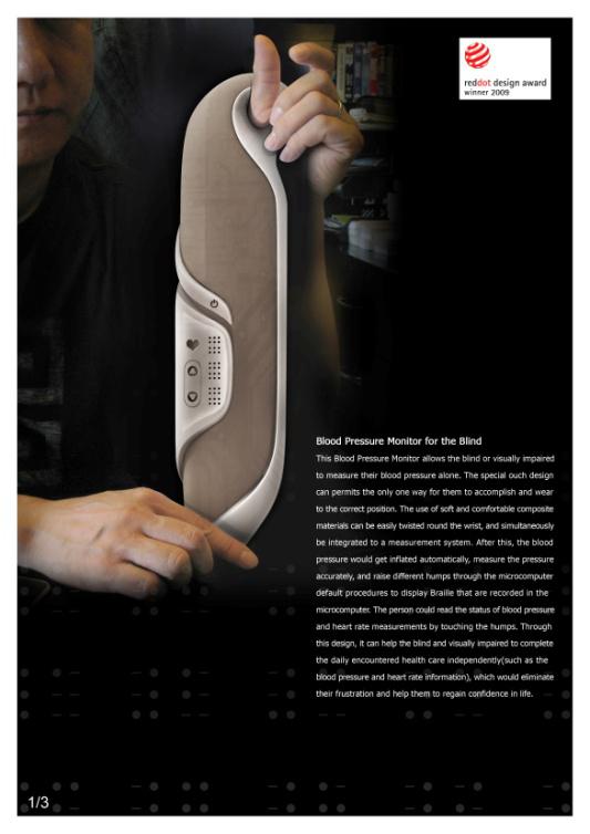 举一个例子。在设计中,对弱势群体的关爱常常是被忽略的一部分。我们在2009年设计了一款盲人电子血压计,这款血压计能够让盲人或视力障碍者独自测量血压。为什么要设计这样一款血压计?这还得从我个人一段切身经历说起。那年,我生病去社区医院打针,在医院里我看见一些盲人在测试血压,但是给正常人使用的血压计,他们却完全感受不到,测试起来非常困难。于是,我开始思考能不能为盲人们专门设计一款方便好用的血压计。有了想法后,我便着手开始设计。经过反复摸索,终于得成。这款产品的特性在于,通过专门设计的扣环让他们可以独立完成唯一的正确的佩戴姿势,采用柔软舒适的复合材料可以很容易的缠绕在手腕部位,并集成测量系统。佩戴完成后自动充气,准确测量血压,并通过微电脑控制预设的程序,产生不同的凸起点,来显示盲文并记录在微电脑中,测量者通过触摸凸起点来了解自己的血压及心率状况。通过该设计能够帮助盲人及视力障碍者独立实现生活中常见的日常保健(血压及心率等生命信息),消除他们在生活中的挫折感,重拾生活的信心。这款产品获得了当年的红点产品设计大奖。而红点奖的评委给出的评语也是,“谢谢你们为这个设计,为这个群体注入了情感,让盲人们得到了尊重。”我想,这一评语也正好对情感设计的进行了诠释吧。